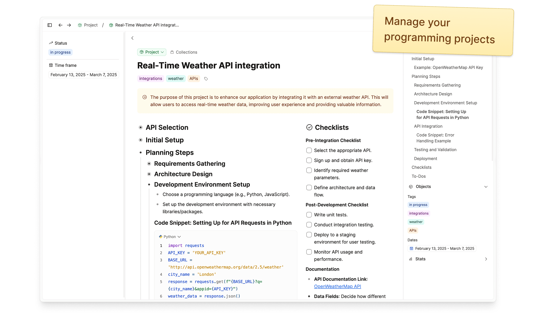 Manage your projects with road maps and checklists. Develop your ideas, store essential resources, and document everything along the way.