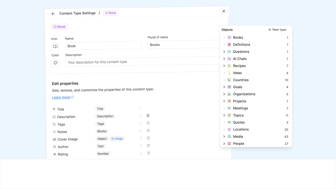 Object-based note-taking is one of Capacities fundamental pillars. Some are built into the app, and you can create custom ones to suit your preferences. Here's how to do that.