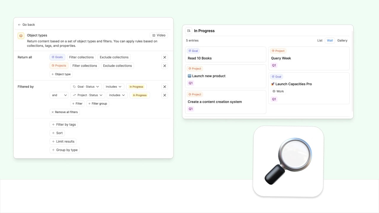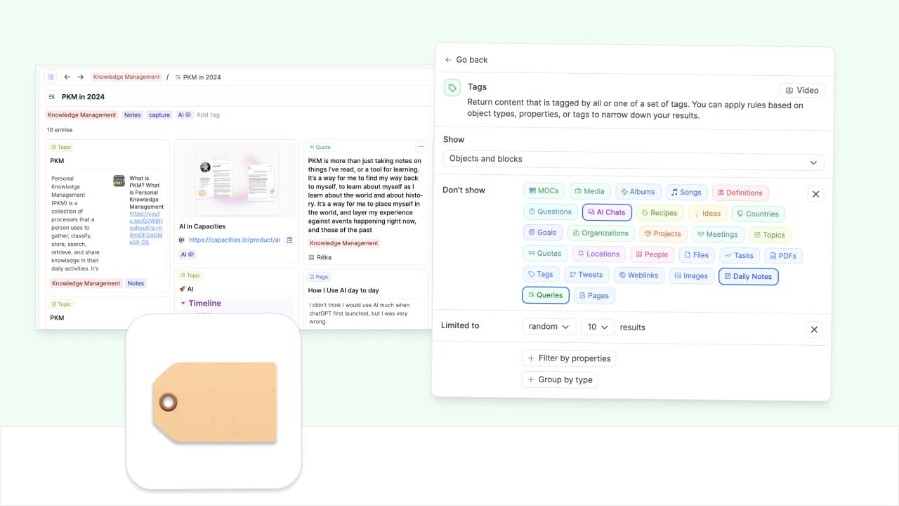 Tag queries are the third type of queries in Capacities, that you can quickly put together from your tag pages.