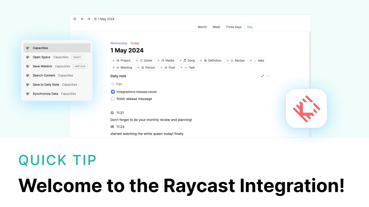 The Capacities extension for Raycast offers quick access to your Capacities data, improving productivity and reducing context switching.